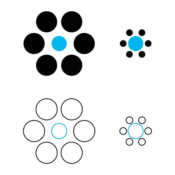 En esta ilusión, los círculos interiores son idénticos en tamaño, sin embargo, la información circundante (es decir, los círculos de alrededor) altera nuestra percepción. Aquí, en lugar de centrarnos en las características individuales de los círculos interiores, nuestra percepción se ve alterada por la información del grupo. Esto se conoce como procesamiento descendente, en el que el elemento completo se percibe antes que las características individuales. Esto contrasta con el procesamiento ascendente, en el que hay una progresión desde las características individuales hasta el conjunto.