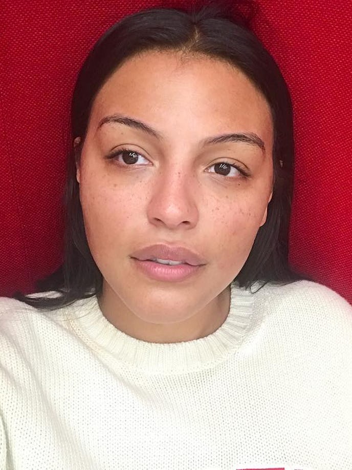Le mannequin Joan Smalls est à fond dans le top knot lisse avec une peau rosée et un smokey eye brun doux.