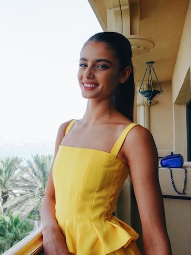 Le mannequin Taylor Hill fait un arrêt rapide à Dubaï, portant une queue de cheval haute et lisse avec un coup de rouge à lèvres rose baie.