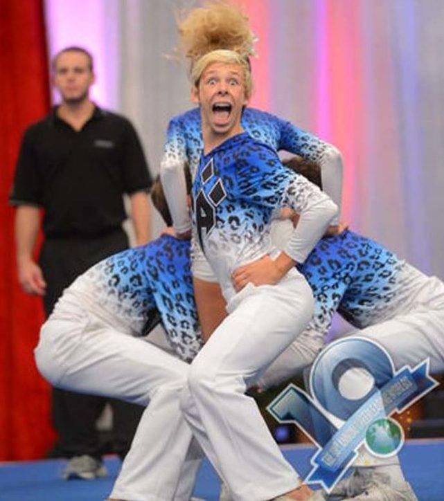 Ce gars a l’air beaucoup trop excité d’avoir quelqu’un assis sur sa tête. Même la fille à droite a semblé remarquer l’expression loufoque sur son visage. Ceci étant dit, la fille qui est tenue est en fait capable de réaliser un split impressionnant. La fille au sommet pense probablement que cela va faire une belle photo, et ne sera probablement pas contente de sa coéquipière quand elle verra le résultat final.