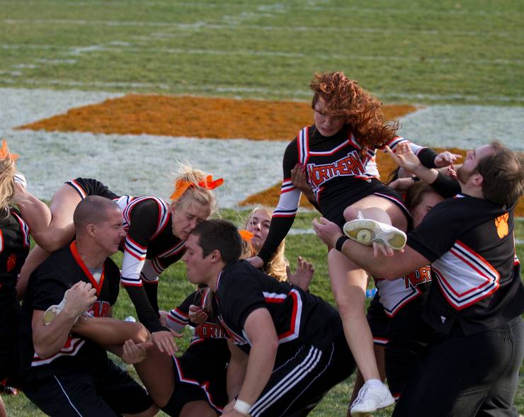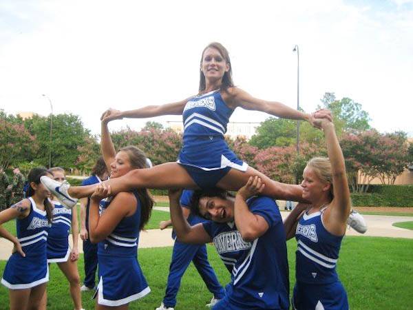 Ce doit être l’un des mouvements de cheerleading les moins orthodoxes jamais vus. On dirait presque que le cheerleader masculin s’apprête à catapulter la fille sur son dos à travers la pièce. De plus, la fille à l’avant de la photo pourrait ne pas apprécier que sa langue soit si proche de son visage. Il se passe certainement beaucoup de choses dans cette image mémorable, car c’est l’une des photos de cheerleaders les plus bizarres que vous ne verrez jamais.