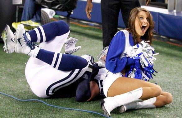 Cette cheerleader des Dallas Cowboys a l’air bien trop surprise sur cette photo. On pourrait penser qu’elle sait, qu’en se tenant à côté de la ligne de touche, qu’il y a de fortes chances que ce genre de chose se produise. Cependant, son air incrédule rend la photo plutôt amusante. On dirait qu’elle va bien, ce qui est un point positif. Cette image prouve que le cheerleading peut parfois être un sport dangereux.