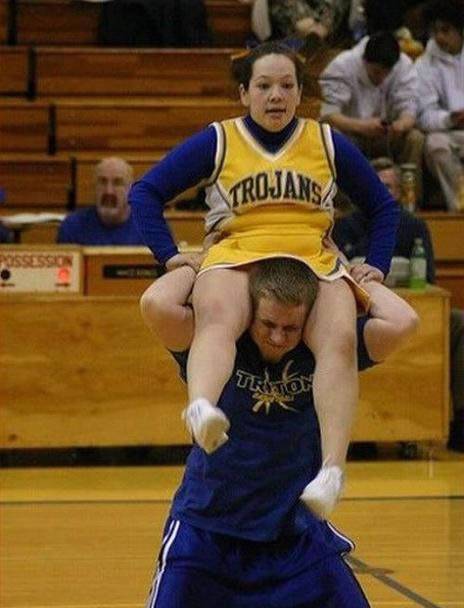 Etre un cheerleader masculin n’est souvent pas aussi prestigieux que pour leurs homologues féminins. Prestige mis à part, devoir soulever ses camarades de l’équipe exige une grande force physique. Les cheerleaders ont tendance à être petits et minces. Cependant, nous savons que les gens peuvent avoir toutes les formes et toutes les tailles et c’est l’une des choses qui contribuent à nous rendre uniques. Ceci étant dit, le gars sur cette photo semble avoir du pain sur la planche en essayant de faire monter cette jeune femme sur ses épaules. D’après l’expression de son visage, son échec ne semble pas être dû à un manque d’effort.